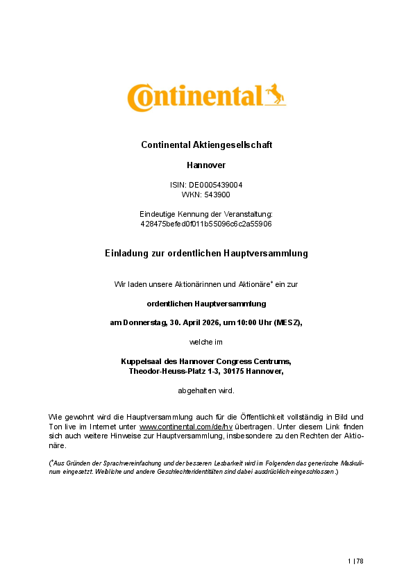 Die Beschlüsse der Hauptversammlung von Continental AG werden im Anschluss der Hauptversammlung hier veröffentlicht.