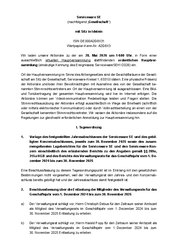 Die Beschlüsse der Hauptversammlung von Serviceware SE werden im Anschluss der Hauptversammlung hier veröffentlicht.