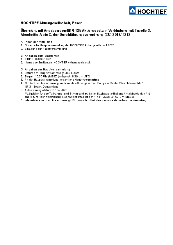 Die Beschlüsse der Hauptversammlung von HOCHTIEF AG werden im Anschluss der Hauptversammlung hier veröffentlicht.