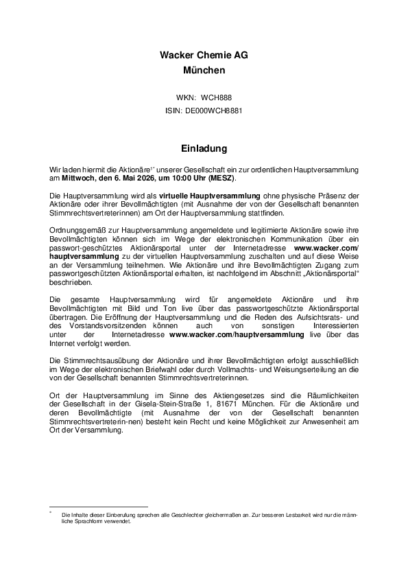 Die Beschlüsse der Hauptversammlung von Wacker Chemie AG werden im Anschluss der Hauptversammlung hier veröffentlicht.