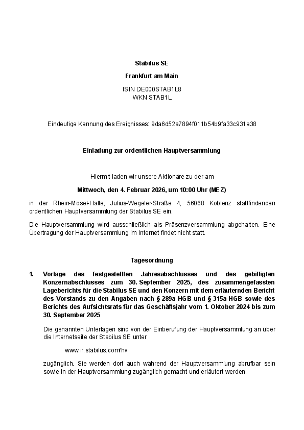 Die Beschlüsse der Hauptversammlung von STABILUS SE werden im Anschluss der Hauptversammlung hier veröffentlicht.