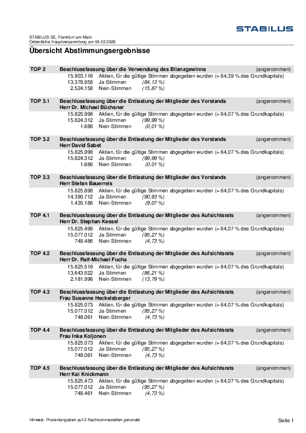 Vorlage des festgestellten Jahresabschlusses und des gebilligten Konzernabschlusses zum 30. September 2025, des zusammengefassten Lageberichts für die Stabilus SE und den Konzern mit dem erläuternden Bericht des Vorstands zu den Angaben nach § 289a HGB und § 315a HGB sowie des Berichts des Aufsichtsrats für das Geschäftsjahr vom 1. Oktober 2024 bis zum 30. September 2025