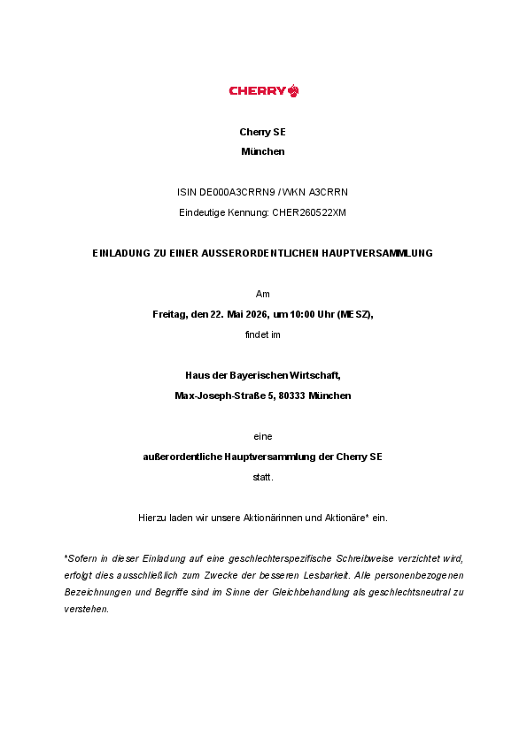 Die Beschlüsse der Hauptversammlung von Cherry SE aoHV werden im Anschluss der Hauptversammlung hier veröffentlicht.