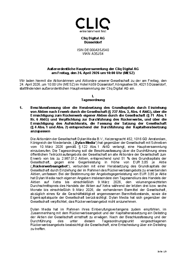 Die Beschlüsse der Hauptversammlung von CLIQ DIGITAL AG aoHV werden im Anschluss der Hauptversammlung hier veröffentlicht.