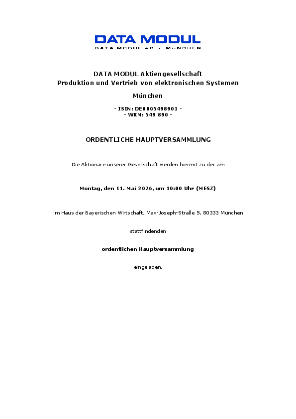 Die Beschlüsse der Hauptversammlung von DATA MODUL AG werden im Anschluss der Hauptversammlung hier veröffentlicht.