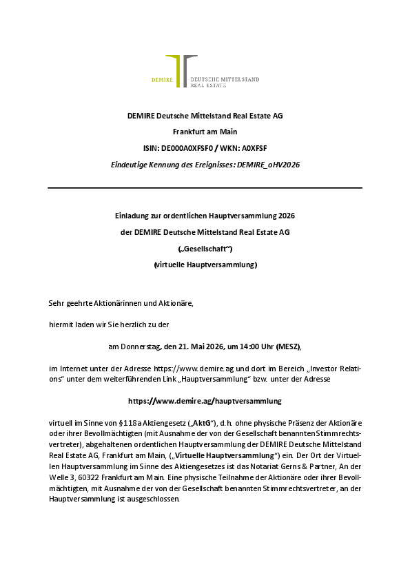 Die Beschlüsse der Hauptversammlung von DEMIRE Deutsche Mittelstand Real Estate AG werden im Anschluss der Hauptversammlung hier veröffentlicht.
