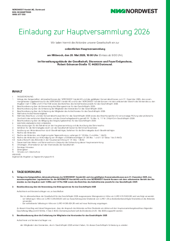 Die Beschlüsse der Hauptversammlung von NORDWEST Handel AG werden im Anschluss der Hauptversammlung hier veröffentlicht.
